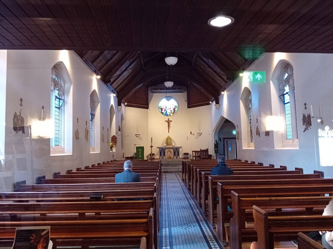 After the flourish of the frontage the interior is disappointingly plain. Plastered walls and boarded roof on simple A-trusses, the purlins with modest embellishment. West gallery with a glazed screen (1999) set back beneath. Pretty organ case (circa 1995 by Kenneth Tickell Ltd of Northampton) cantilevered from the centre of the gallery. Lady Chapel enlarged and rebuilt in 1999, at a right angle to the sanctuary. The roof of the old chapel is hung as a kind of tester or baldacchino. Altar and elaborate Gothic reredos, eighteenth century Austrian, set within a side-lit projecting bay. Regrettably it is taller than the segmental arch into the bay. Heavy stone and marble main altar, brought forward from the tabernacle which stands on a stone plinth against the east wall. Standing on a corbel on the north wall is a statue of St John of Beverley, possibly medieval though in very good condition and more likely to have come from the Minster in the late nineteenth century when new statues were placed in vacant niches on the west front. Two 1920s stained glass windows, one on the north and one on the south side, in fifteenth century style, possibly the work of Geoffrey Webb (who trained with Kempe and Comper). The altar rails were removed in 1970 as part of the alterations following Vatican II. The Stations of the Cross, painted on metal, were originally in oak frames but were cut down in 1948 and fixed to the walls.