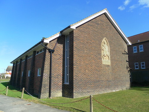 The first church was built in 1959, from designs by Clayton, Black & Daviel. This was replaced by the present church in 1971 (architect/designer not established). This is a simple cruck-built design consisting of nave and sanctuary, clad in brick and with battered buttresses rising to the full height of the nave walls. There is a thin clerestory band between the buttresses. A relief carving of St Theodore on the external east wall is by Joseph Cribb and came from the previous church. The Stations of the Cross look as though they are by The Guild of St Joseph and St Dominic at Ditchling.