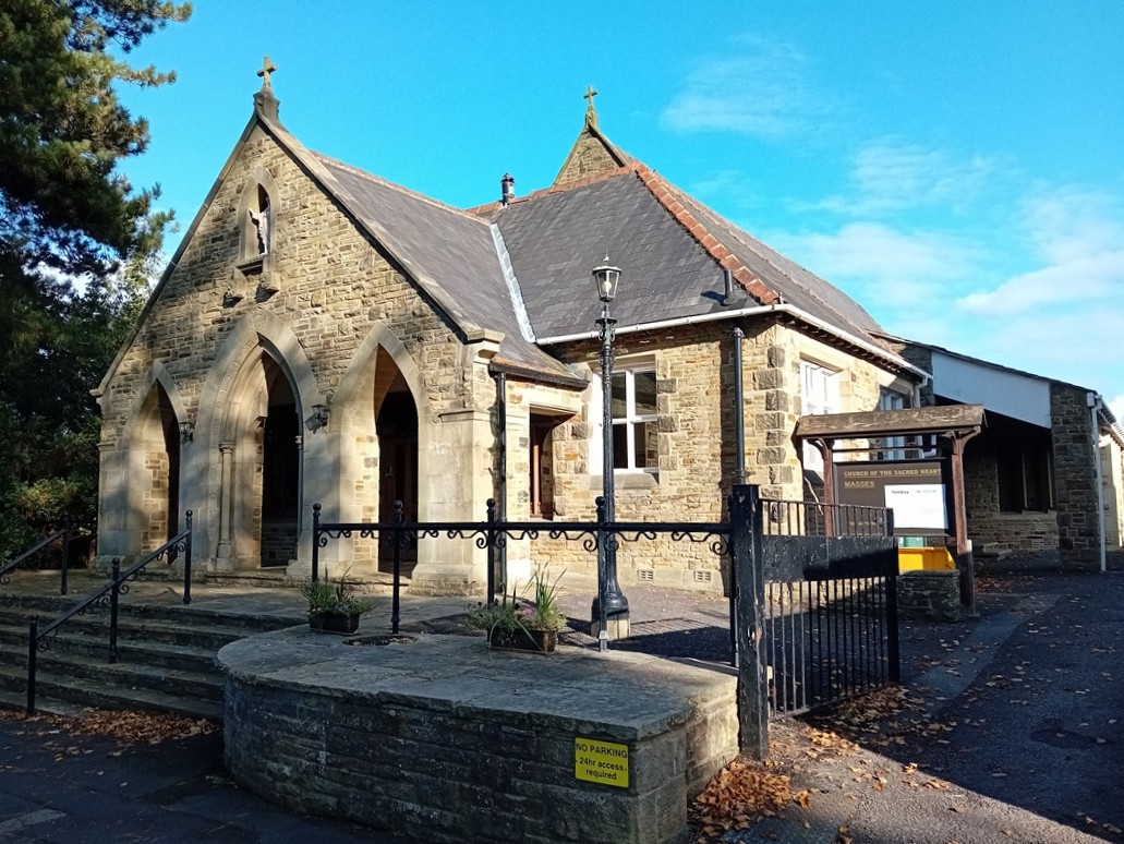 The principal elevation facing Stockeld Road is the west front, rebuilt in the 1979 reordering. To the centre is a projecting gabled portico of coursed, irregular gritstone with slate roof. Three pointed arches with sandstone dressings. The central arch is re-used from St Walburga’s in Shipley and the stone has been re-dressed and carved. Over this is a small niche containing a statue of Our Lady and the gable itself is surmounted by a small stone cross. To the rear on either side, the four-paned windows of the front elevation of the original school are visible. The south and north elevations reveal the later single storey splayed walls with four tall vertical windows.