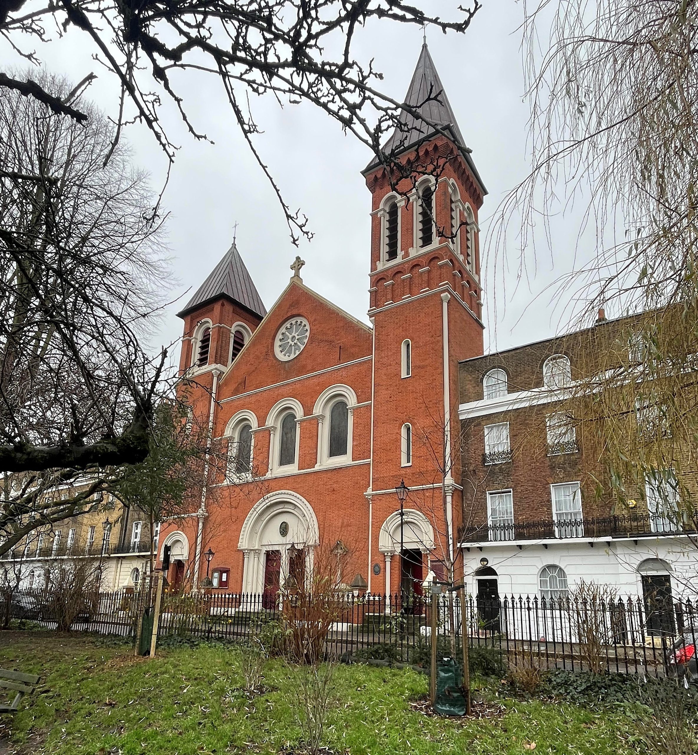 A neo-Romanesque brick church built in the 1840s from designs by J. J. Scoles. The asymmetrical towers on the main frontage were completed in the 1870s by George Goldie. The chief furnishings are now in the side chapels, and include paintings by Edward Armitage RA amongst others. The church is flanked by contemporary London stock brick terraces, which include the presbytery and convent. It is a significant landmark in the local conservation area.