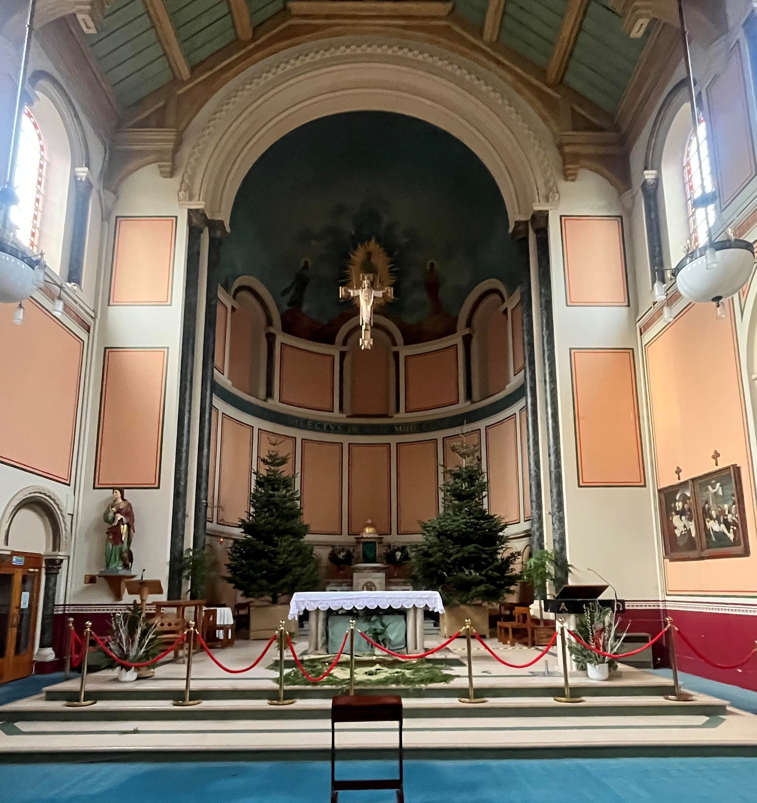 In the post-war period, the formerly lead-covered spires were re-covered in copper. At some point the Armitage paintings in the sanctuary apse were covered over or destroyed, and in 1962 the Aglio painting in the semi-dome of the apse was replaced with a new painting of the Transfiguration by Bartlett & Purnell. In 1963 the organ was rebuilt by Walkers, reusing some of the old pipework, but now located in the west gallery. In 1969, Scott & Jaques prepared plans for reordering of the church, a meeting room in the Blessed Sacrament Chapel and a new sacristy, but these were not taken forward (the current forward altar was installed as part of a 1973 reordering, when the 1860s high altar was dismantled and the communion rails removed). In 1977-8, the crypt was excavated under the direction of Joan Davis to create a youth club. In 2004-06 the nave and sanctuary were redecorated, rewired and a new lighting scheme installed (by Lighting Interiors). In 2010, the paint schemes in the Lady Chapel and St Francis Chapel were restored by IFACS. In 2011 the Walker organ was restored by Keith Bance of Harrow.