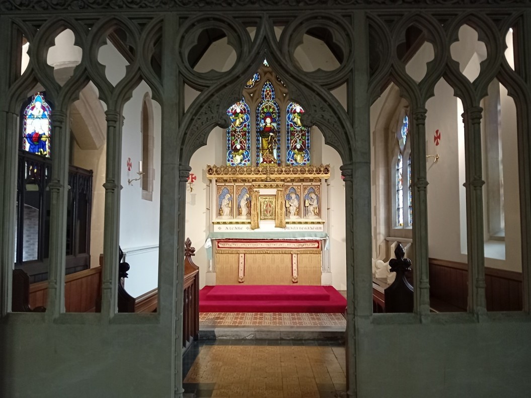 Immediately in front of the screen on the south nave wall is the elaborate Gothic tomb of the founder Charles Scott Murray and members of his family (designed by ‘Mr Buckler’, according to Scott Murray’s 1882 obituary in The Tablet, presumably C.A. Buckler). On the north side of the screen is the original stone pulpit. The chancel has decorative encaustic floor tiles, a piscina and sedilia on the southern wall, a carved and painted stone reredos, presumably designed by Pugin, and a boarded timber roof painted blue with stars and the emblem of St Peter. Many of the windows are filled with stained glass by Hardman, one of which was donated by the Earl of Shrewsbury and both nave and aisle have their original benches.