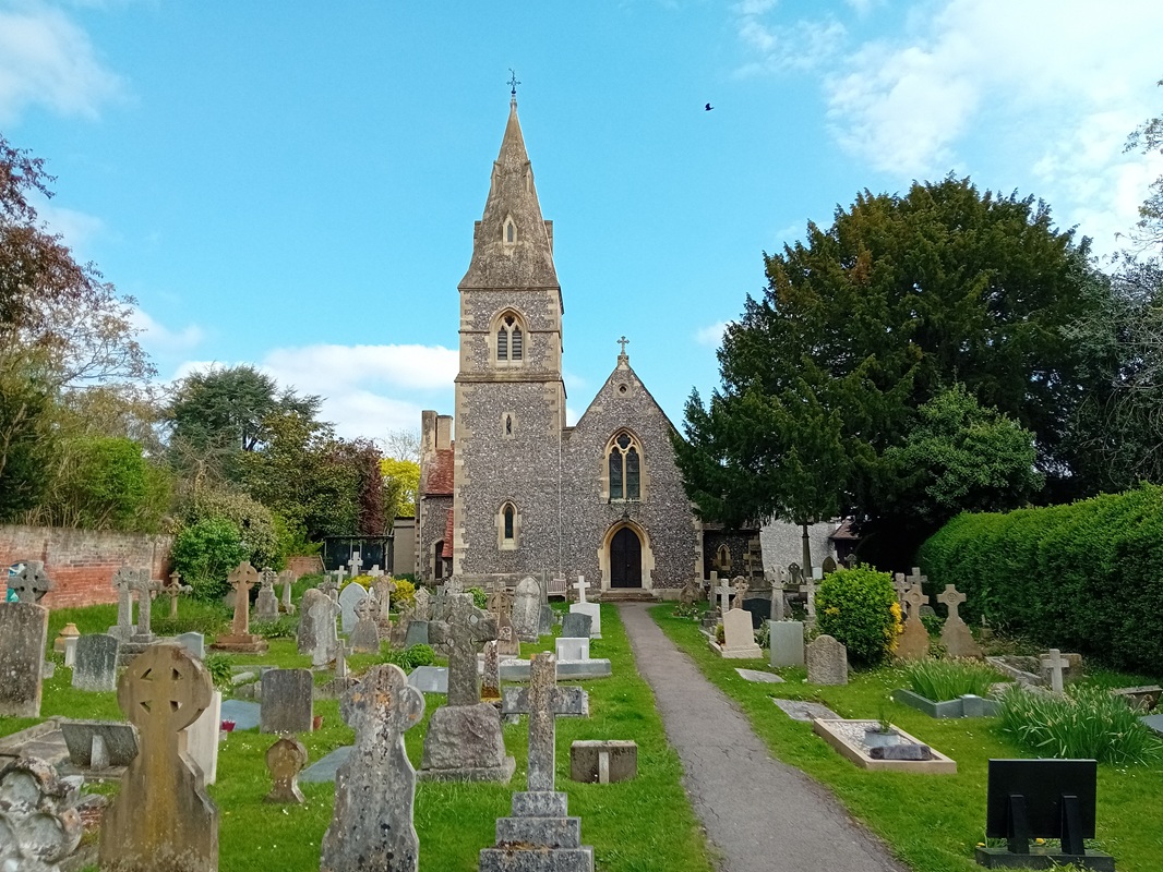 1846 by Augustus Welby Northmore Pugin. Flint with stone dressings. Unsymmetrical West front facing street with gabled end to nave and tower on North side, with broached stone spire. Contains famous relic said to be hand of St James the Apostle, possibly that of St Anastasius, martyred in C7. (Both these relics originally in Reading Abbey). Rood screen by G Myers and metal work and glass by Hardman. Listing NGR: SU8521686361