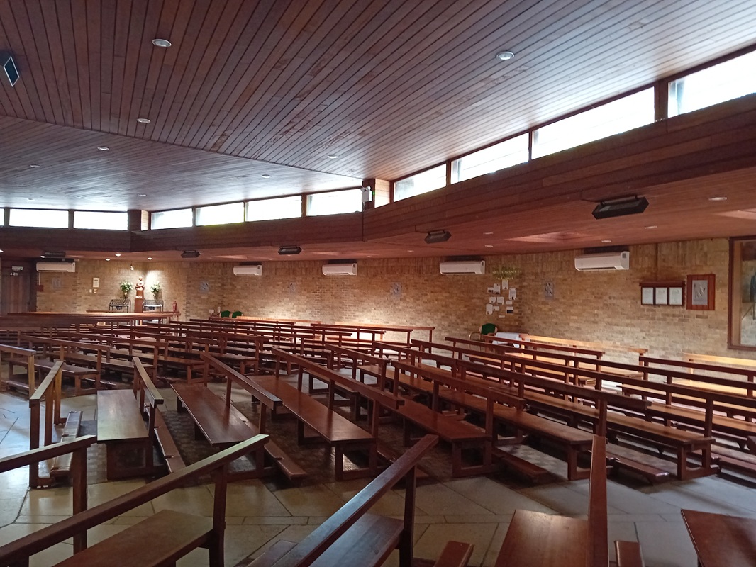 A short passage below the east window of the former Lady Chapel leads to the new church, which has a fan-shaped interior with a stone and parquet floor, bare brick walls, a flat timber boarded ceiling and benches. The space is lit by strip clerestory windows facing towards the sanctuary which is top-lit by a tall pointed roof and is marked by a large mosaic panel of the Ascension of Our Lord on the wall behind the altar, by Mariano Villalta. A Madonna and Child carved in African cherry is by David John (1981).