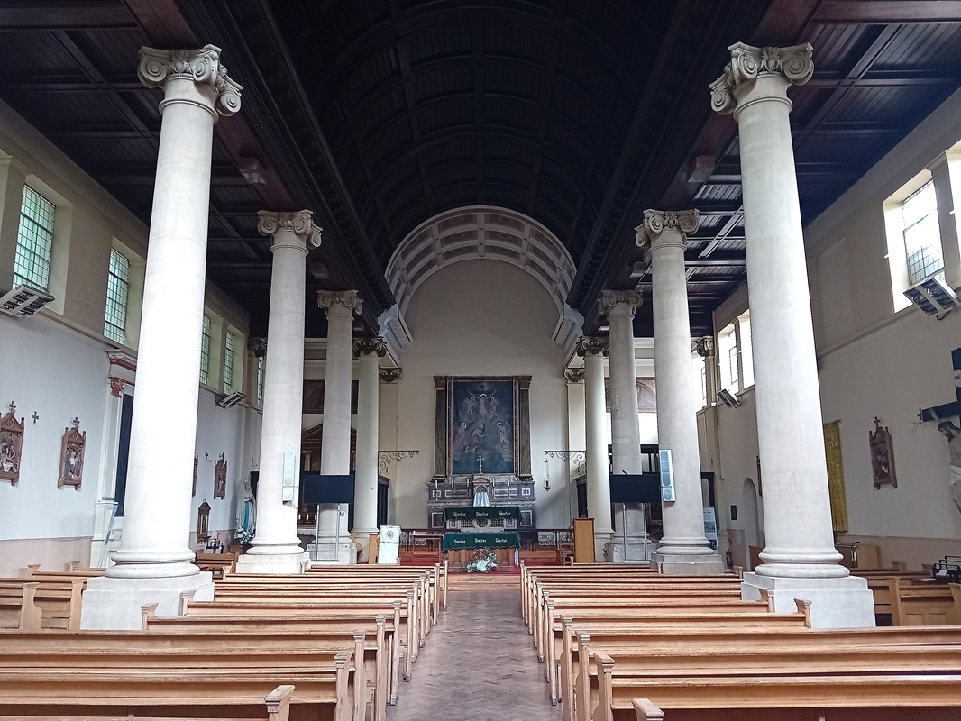 The interior is six bays in length, of which the eastern two accommodate the sanctuary with Lady Chapel to north and organ to south. The coffered timber wagon roof over the nave is unpainted, while its continuation over the sanctuary is painted. The nave is divided from the flat-ceiled aisles by giant Ionic columns of Bath stone, which in the sanctuary also have swags.